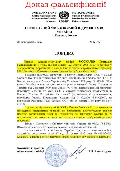 После возвращения делегации из Косово кадровики МВД направляли указание: «Срочно отправить документы по единому образцу для всех членов делегации» В качестве образца справки об участии в боевых действиях – справка, выданная генерал-лейтенанту милиции Москалю Г.Г. от 25.10.2005 № K1/821, в которой указано буквально следующее: «Выдана генерал-лейтенанту милиции МОСКАЛЮ Геннадию Геннадьевичу в том, что он действительно 22 октября 2005 года находился в зарубежной командировке в составе Специального миротворческого подразделения МВД Украины в Косово (бывшая Союзная Республика Югославия)… Во время нахождения в миссии ООН в Косово Москаль Г.Г. привлекался к проведению специальных операций по перекрытию контрабандных путей провоза огнестрельного оружия и наркотиков на территорию Косово и их изъятию, а также к операциям по конвоированию взрывоопасных предметов. Согласно п. 2 ст. 6 Закона Украины “О статусе ветеранов войны, гарантии их социальной защиты” от 22 декабря 1995 года, Москаль Геннадий Геннадьевич имеет право на льготы как участник боевых действий». Возникает много вопросов: как мог первый заместитель Министра внутренних дел генерал-лейтенант милиции Москаль Г.Г. входить в состав подчиненного ему спецподразделения, а подчиненный ему командир этого подразделения привлекать генерала к проведению нескольких спецопераций в течение одного дня?!