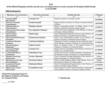 В Косово я служил 3 раза по году с перерывами до года между командировками. Осенью 2005 года я проходил службу в Украине и ожидал очередной отправки в Косово. С целью получения информации о социально-политической и криминогенной ситуациях в Косово я регулярно отслеживал служебную переписку и отчеты специального миротворческого подразделения МВД Украины в Косово. Как раз в это время я натолкнулся на всю переписку МВД, содержащую указания об организации поездки делегации МВД для участия в медальном параде 22 октября 2005 года. Сначала поступило указание командиру украинского миротворческого подразделения направить приглашение по имеющемуся образцу, потом из МВД поступил подробный поминутный план проведения «медального парада» с указанием времени вылета из Киева, прилета в Приштину (столицу Косово), времени и подробного плана перемещений делегации по Косово, времени возвращения в Киев. Потом поступил список самой делегации МВД, а только в конце - запрос к Главному штабу миссии ООН для получения разрешения на прибытие делегации в Косово. То есть, вместо официального приглашения или запроса руководства ООН МВД само инициировало отправку делегации и запрашивало разрешение на прибытие делегации в Косово. По сути, делегация МВД была самозваной: официального приглашения не было!