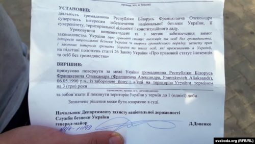 В решении о принудительном возвращении, подписанном начальником Департамента защиты национальной государственности Даниилом Доценко за 20 дней до того (30 мая 2019 года), говорится, что Францкевича следует принудительно обязать «покинуть территорию Украины в срок до одних суток», поскольку его деятельность «противоречит интересам обеспечения национальной безопасности Украины, ее суверенитета, территориальной целостности и конституционного строя».