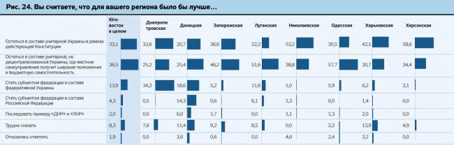 Вопрос был задан жителям восьми юго-восточных областей Украины. В целом, 36,5% жителей условного Юго-Востока в целом хотят остаться в составе унитарной, но децентрализованной Украины, где местное самоуправление получит широкие полномочия и бюджетную самостоятельность (см. диаграмму)