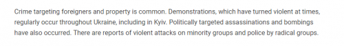 «По всей Украине, в частности в Киеве, регулярно проходят демонстрации, иногда сопровождавшиеся насилием. Также имели место политические убийства и взрывы. Поступают сообщения о нападениях радикальных групп на группы меньшинств и полицию», – добавили в посольстве.