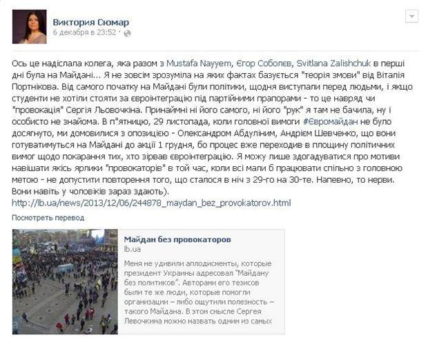 Так, Сюмар критически прокомментировала на свой странице статью Портникова, в которой тот указал, что на руку администрации президента играет армия "провокаторов в журналистской и общественной среде", присутствующая на Евромайдане. Ни одной фамилии Портников не назвал.