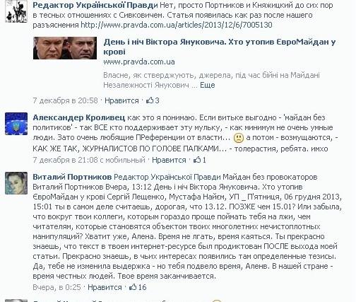 В комментариях к этому посту Алена Притула, главный редактор "Украинской правды", оставила такое сообщение: "Портников и Княжицкий до сих пор в тесных отношениях с Сивковичем. Статья появилась как раз после нашего разъяснения" и прикрепила ссылку на публикацию в УП.