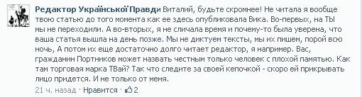 "Виталий, будьте скромнее! Не читала я вообще твою статью до того момента как ее здесь опубликовала Вика. Во-первых, на ТЫ мы не переходили. А во-вторых, я не сличала время и почему-то была уверена, что ваша статья вышла на день позже. Мы не диктуем тексты, мы их пишем, порой всю ночь, а потом их еще достаточно долго читает редактор, я например. Вас, гражданин Портников может назвать честным только человек с плохой памятью. Как там торговая марка ТВай? Так что следите за своей кепочкой - скоро ей прикрывать лицо придется. И не только от меня".