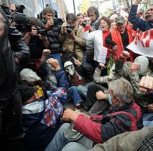 Перед аркой, которая ведет к зданию Печерского суда, произошло столкновение между "Беркутом" и сторонниками экс-премьера Юлии Тимошенко.