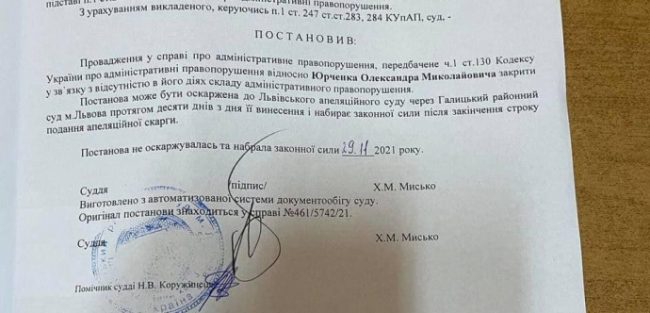 В конце концов, суд пришел к выводу, что в действиях Юрченко нет состава административного правонарушения, и дело закрыл.