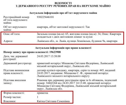 Очевидно, этого Светлане Квитке оказалось мало, поэтому через год она снова осуществляет дорого стоящую покупку. Выбор женщины пал на квартиру меньшей площади, но с более выгодным размещением — в центре. За квартиру в 70 кв. м. было заплачено 1712000 грн.