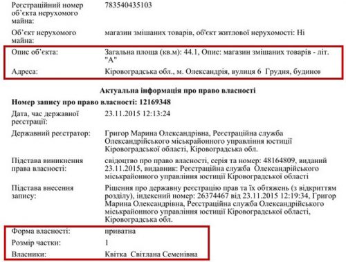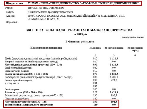 Впрочем, открытым остается вопрос, как матери судьи Светлане Квитке удалось заработать на численное недвижимость и недешевые транспортные средства? Можно ли сэкономить миллионы, торгуя в магазине продуктами питания и напитками, как это записано в документах физического лица предпринимателя? Конечно, судья на собеседовании может апеллировать к тому, что его мама имеет собственную компанию. Действительно, Светлана Семеновна значится учредителем и директором единственной фирмы — ООО «Агрофирма« Олександрияконссервис »с разрешением на осуществление таможенной и брокерской деятельности. Однако не каждая компания приносит хорошие прибыли. Нам удалось отыскать финансовый отчет агрофирмы за 2013 год. Оказалось, что предприятие имело лишь 192.5 тыс. Грн чистого дохода или чуть больше 16000 гривен не месяц. Из этой суммы даже не вычислены заработные платы работникам. По сведениям аналитической системы youcontrol в 2014 году «Олександрияконссервис» имела почти идентичные показатели. Поэтому вряд Александру Алексеевичу удастся доказать, что имущество куплено за доходы от бизнеса.