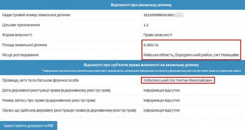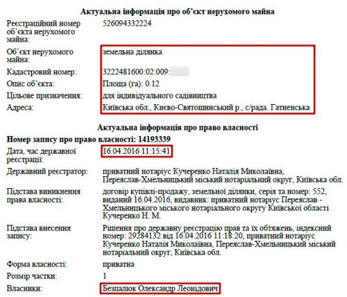 В собственности Константина Николаевича Кобылянского есть два гаража в Киеве и земельный участок в пгт. Немишаев. Интересно, что на кадастровой карте его площадь 0.1051 га, а в декларации — 0,1047 га. Расположен он в месте, где уже построены элитные частные дома.
