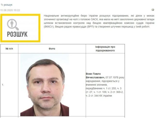 Национальное антикоррупционное бюро Украины объявило в розыск семерых фигурантов дела Окружного админсуда Киева, в том числе его председателя Павла Вовка.