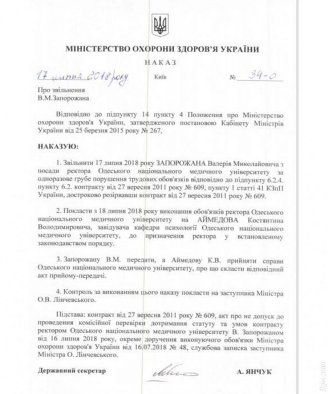 Министр здравоохранения Украины Ульяна Супрун подписала приказ об увольнении с должности ректора Одесского национального медицинского университета почетного гражданина Одессы Валерия Запорожана.