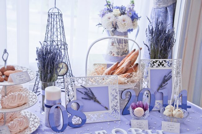 С основными оттенками оформления банкетного зала (обычно здесь преобладает лавандовый во всех его проявлениях) определяются заранее, чтобы используйте их в дизайне. В пригласительных указывают пожелания по дресс-коду, знакомят гостей с форматом свадьбы. Если приложить к каждому веточку лаванды, это поможет настроить всех на нужный лад.