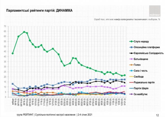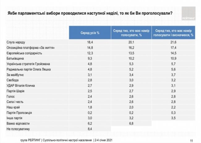 В тройке лидеров парламентского рейтинга — партии «Слуга народа», «Оппозиционная платформа — За жизнь» и «Европейская солидарность».