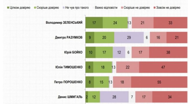 Кроме того, 29% опрошенных доверяют председателю Верховной Рады Дмитрию Разумкову, 37% — не доверяют (29% — его знают).