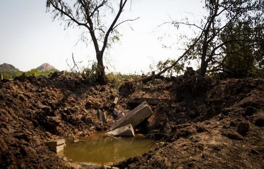 14.08.14. На окраине Донецка 2 огромные воронки. Ополченцы утверждают, что это удары баллистическими ракетами. Рядом нет жилья, только озеро. Одна воронка полностью перекрыла объездную дорогу р-на Петровский Донецка.