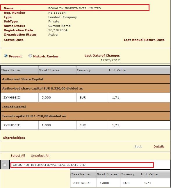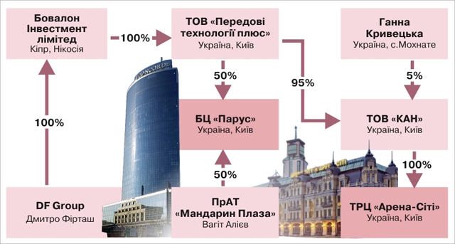 Очевидно, что 66-летняя пенсионерка, которая живет в с. Мохнатое Турковского района Львовской области, является лишь номинальным совладельцем ООО «КАН». Ей принадлежит 5%, остальные 95% - ООО «Передовые технологии плюс», основанному в 2004 году кипрским офшором BOVALON Investments Limited. Согласно выписке из кипрского реестра прав собственности, основателем и владельцем 100% компании BOVALON Investments Limited является Group DF International Real Estate Ltd, входящая в группу компаний Дмитрия Фирташа Group DF.