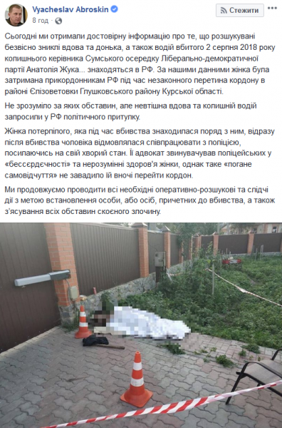 Замглавы Национальной полиции Вячеслав Аброськин сообщил на своей странице в Facebook:»Сегодня мы получили достоверную информацию о том, что разыскиваемые без вести пропавшие вдова и дочь, а также водитель убитого 2 августа 2018 бывшего руководителя Сумского отделения Либерально-демократической партии Анатолия Жука… находятся в РФ. По нашим данным женщина была задержана пограничникам РФ при незаконном пересечении границы в районе Елизаветовки Глушковского района Курской области. Непонятно по каким причинам, но безутешная вдова и бывший водитель попросили в РФ политического убежища. Жена погибшего, во время убийства находилась рядом с ним, сразу после убийства мужа отказывалась сотрудничать с полицией, ссылаясь на свое больное состояние. Ее адвокат обвинял полицейских в «бессердечности» и непонимании проблем со здоровьем у женщины, однако такое «плохое самочувствие» не помешало ей ночью перейти границу. Мы продолжаем проводить все необходимые оперативно-розыскные и следственные действия с целью установления лица, или лиц, причастных к убийству, а также выяснения всех обстоятельств совершенного преступления».