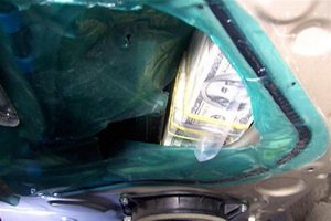 При углубленном осмотре конструктивных полостей автомобиля были выявлены аккуратно запакованные в полиэтиленовые пакеты 1 млн. 820 тыс. долларов