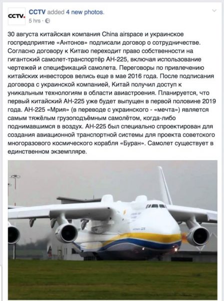 Аналогичная ситуация произошла летом в 2017 году, когда появилась информация о «масштабной сделке с китайцами». Как стало известно тогда из китайских источников, 30 августа компания China Аirspace и украинское госпредприятие «Антонов» подписали договор, согласно которому Китаю переходит право собственности на гигантский самолет-транспортёр Ан-225 «Мрия», включая использование чертежей и спецификаций самолета.
