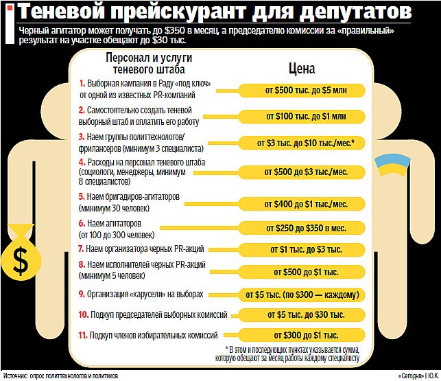 Не секрет, что, желая добыть заветную депутатскую корочку, многие кандидаты в Верховную Раду пускаются во все тяжкие, активно пользуясь черными политтехнологиями. Для этого будущие депутаты не скупятся на организацию теневых выборных штабов (см. иллюстрацию), где работают специалисты, владеющие изощренными методами очернения конкурентов. «Сегодня» встретилась с опытным черным PR-технологом, который раскрыл нам некоторые секреты кухни теневых выборных штабов.