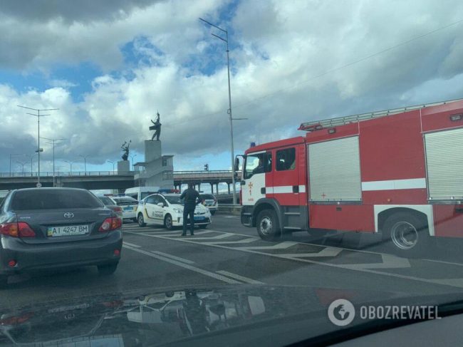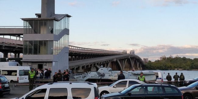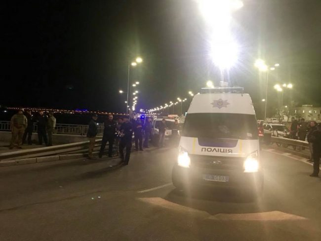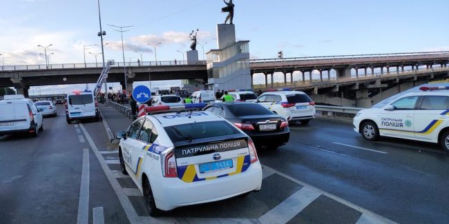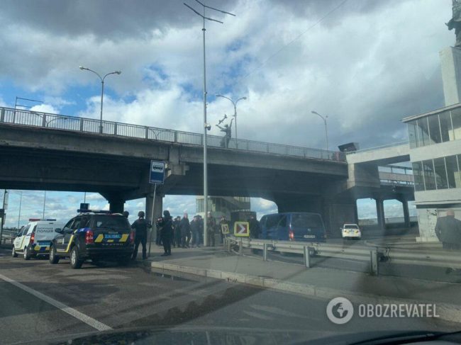 Позже начальник пресс-службы ГУНП в Киеве Оксана Блищик в Facebook подтвердила, что в полицию поступило сообщение о том, что неизвестный заблокировал движение на мосту Метро и угрожает взорвать его и государственные учреждения.