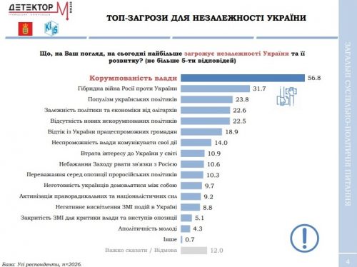 Респондентов спросили, что, по их мнению, сегодня больше всего угрожает независимости Украины. Абсолютное большинство считает, что основной угрозой является коррумпированность власти (57%). На втором месте со значительным отрывом — гибридная война России (32%). От 22% до 24% считают опасными популизм украинских политиков, зависимость от олигархов и отсутствие новых, некоррумпированных лиц в политике.