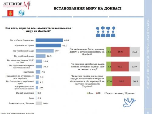 В вопросе установления мира на Донбассе украинцы склонны считать ответственной больше украинскую власть, чем российскую. 46% опрошенных считают, что мир прежде всего зависит лично от президента Петра Порошенко. Владимира Путина назвали ответственным 43%, 30% — украинские власти и 17% — российские.