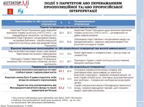 Респондентам предложили интерпретировать 15 актуальных событий. Было предложено два взгляда: один условно прогосударственных, другой прооппозиционный или пророссийский. Так, 55% опрошенных отметили, что Олег Сенцов — политический заключенный, а почти 4% поддержали тезис российской пропаганды о том, что он террорист. Остальные — более 40% — не определились или не захотели отвечать.