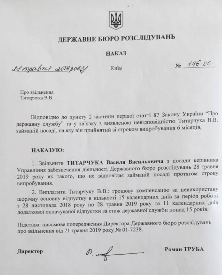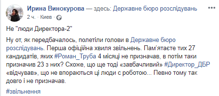 «Полетели головы в ГБР. Первая официальная волна увольнений. Помните тех 27 кандидатов, которых Роман Труба 4 месяца не назначал, а потом, таки назначил 23 из них? Похоже, что еще тогда «предусмотрительный» директор ГБР «чувствовал», не справятся эти люди с работой…», — написала Винокурова и опубликовала указы об увольнении.