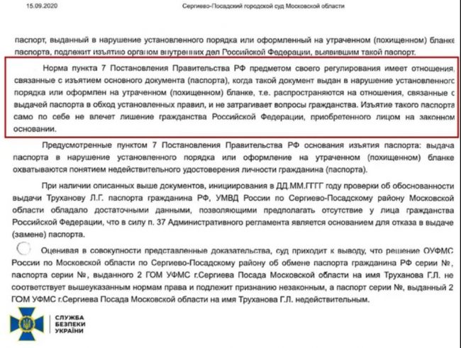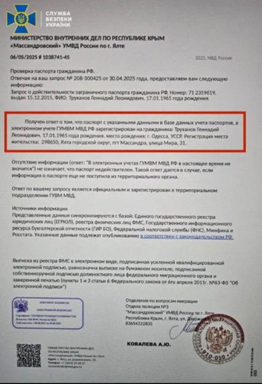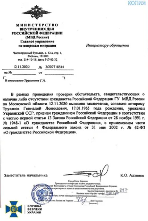 «Геннадий Труханов до сих пор остается гражданином РФ. Он также имеет идентификационный код, который отображается в базе данных «федеральной налоговой службы РФ»», — добавили в СБУ.