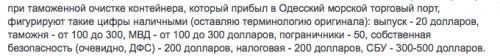 Из портов большой Одессы может в сутки выходить до 800 контейнеров, т. е. наличными под миллион долларов «неучтенки» в сутки может получиться. В год — сотни миллионов наличных долларов. На всех служивых, правда. Не на одну конкретную службу, на всех: таможня, пограничники, внутренняя безопасность таможни, налоговая, собственно полиция и, конечно, СБУ… Озвучиваются суммы действующих поборов из Парламента, был публично обнародован выборочный акт проверки деятельности Одесской таможни с убытками в 500 млн гривен, а Премьер ничтоже не сумняшеся назначает одесского начальника уже и.о. всея украинской таможни…