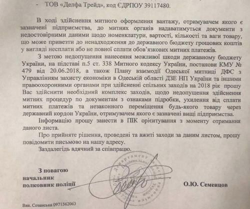 Ниже на фото — письмо от какого-то одесского полковника полиции. Начало письма и его окончание. В промежутке перечень из сотни предприятий, которых одним росчерком своего пера полковник Семенцов отправил в убытки из-за простоев, никому ненужных досмотров или других таможенных форм контроля.