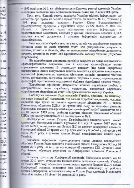 В решении сказано: «Во время исследования указанных обстоятельств взято во внимание нормы статьи 358 и статьи 366 Уголовного кодекса… Совет адвокатов Украины пришел к выводу, что выше описанные действия подпадают под признаки подделки документов, поскольку свидетельство на занятие адвокатской деятельностью №1, выданное Ровенской областной КДКА 25 декабря 2001 года, не соответствует решению Ровенской областной квалификационно-дисциплинарной комиссии адвокатуры №1 от 8 июня 1993 года, поскольку отсутствует решение Ровенской областной КДКА о замене свидетельства №41 на свидетельство под №1», — говорится в решении.