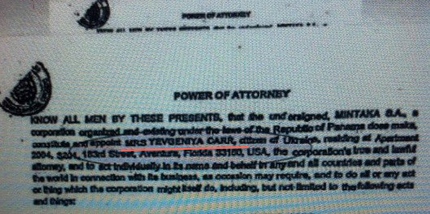 Главный документ - копия доверенности, подписанной между некой панамской компанией Mintaka S. A. и Евгенией Карр. Документ дает право Евгении Карр представлять интересы компании в сфере ее бизнеса по всему миру.