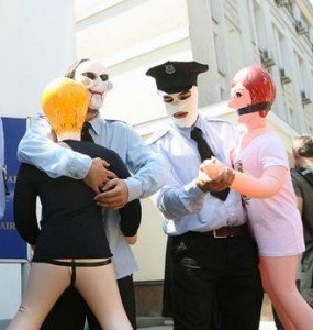В частности, три участника акции одетые в милицейскую форму символизировали МВД, прокуратуру и СБУ. Они принесли с собой три резиновые женщины и имитировали с ними изнасилование.