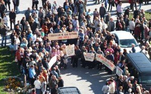 Активисты выкрикивают следующие лозунги: «Позор», «Предатели» и «Губарев-Губарев» и призывают ополчение спасти их жизни. Стоит отметить, в митинге в основном участвуют женщины пенсионного возраста.