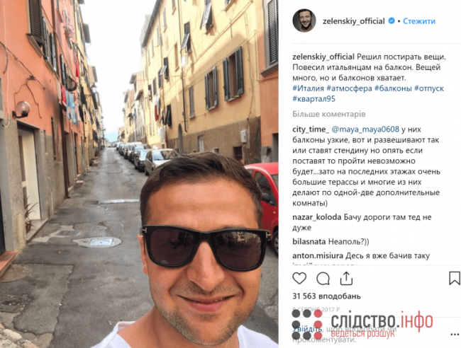 "Посещает ли Зеленский тосканскую виллу, неизвестно. В его Instagram удалось найти лишь одно фото из неизвестного итальянского городка, датированное 9 августа 2017-го. К тому времени семья Зеленского, скорее всего, уже владела виллой в Форте-дей-Марми", – пишет издание "Слидство.Инфо".