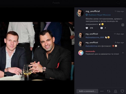 Как писал CRiME, Максим Глущенко параллельно с «работой» в «Укроборонпроме» довольно успешно занимался нефтегазовым бизнесом вместе с «младоолигархом» Сергеем Курченко и его кукловодами - братьями Кацубами. Дружной компанией они летали на самолете Курченко в Монте-Карло, Ниццу и т.д., разъезжали там на роскошных авто типа «Роллс-Ройс» и «Феррари». Сейчас он тоже не стесняется летать в Москву и общаться с Курченко. Ну, и погулять тоже шанса не упускает (см. скрины из Инстаграм с геопозицией: Роял Арбат, Рэдиссон Роял, Москва и т.д.).
