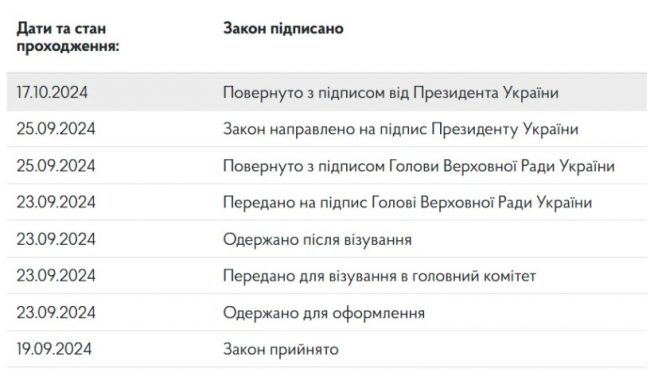 Речь идет о законопроекте № 11474. Как свидетельствует его карточка на сайте парламента, документ был возвращен с подписью президента 17 октября. Во втором чтении его приняли еще в сентябре, тогда за проголосовали 260 нардепов.