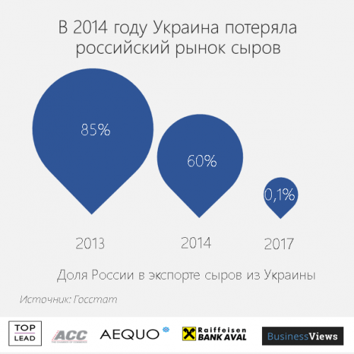 Впрочем, производство сыра в Украине как раз в 2014 году, после потери российского рынка, резко упало, по некоторым позициям — почти на треть, и пока что не восстановилось до прежнего уровня.