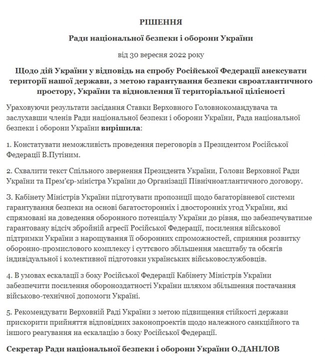 Первым пунктом в решении Совета нацбезопасности указано следующее: «Констатировать невозможность переговоров с президентом Российской Федерации В. Путиным».