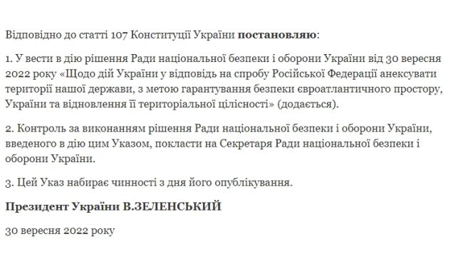Текст соответствующего документа (указ №679/2022) был опубликован на сайте Офиса президента Украины 4 октября. Отметим, что свою подпись под ним украинский лидер поставил еще в день заседания СНБО (30 сентября).