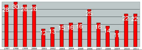 Это данные МВД о числе заказных убийств в Украине в 1997-2011 годах (опубликованы в «Forbes-Украина»).