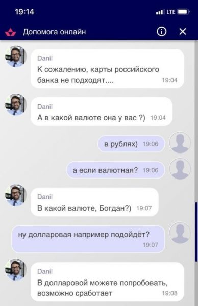После выяснения, что валютная карта российского банка может подойти и пользователь из РФ может попробовать зарегистрироваться таким образом, Данил вместо того, чтобы послать россиянина вслед за русским военным кораблем, проявив свою гражданскую позицию, напротив, любезничает с россиянином, попрощавшись с ним фразой «Было очень приятно пообщаться!”.