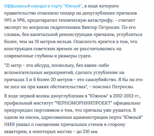 Т.е. технически опасно, Премьер тендер отменил, а его (тендер) снова провели одни и те же портовые чиновники. Но, правда, дешевле. «За чей счет банкет»? Теперь уже копают китайцы за твердую валюту все к тем же 21 метру глубины, а чиновники от портов опять переводят миллиарды из портовых сборов в ничем экономически неоправданное и технически опасное дноуглубление под причалами для руды моно-заказчика. Одно, исключительно единственное, оправдание подобного «экономического копания» может быть: подготовка к покупке еще больших объемов гречки на предстоящие выборы. Деньги же не свои «закапывают», да и Премьер в теме...