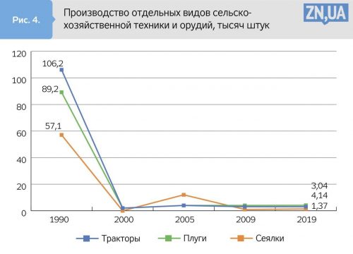 При этом по состоянию на 1990 год потребность в техническом перевооружении сельского хозяйства составляла почти 100%. К сожалению, ее удовлетворяли иностранные производители. В 2019 году Украина закупила за рубежом сельскохозяйственной техники на 700 млн долл. Особенно поражает, что на 9,5 млн долл. купили в Германии плугов, этого несложного в производстве оснащения.
