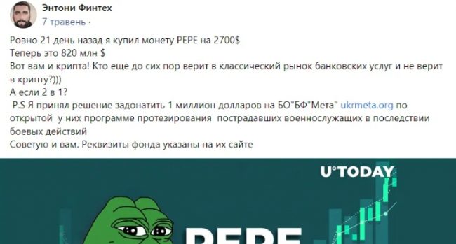 «Ровно 21 день назад я купил монету PEPE на $2700. Теперь это $820 млн… Я принял решение задонатить 1 миллион долларов на БО «БФ «Мета» по открытой у них программе протезирования пострадавших военнослужащих», – написал Антон Сватик, СЕО «Финтех Девелопмент», 7 мая.