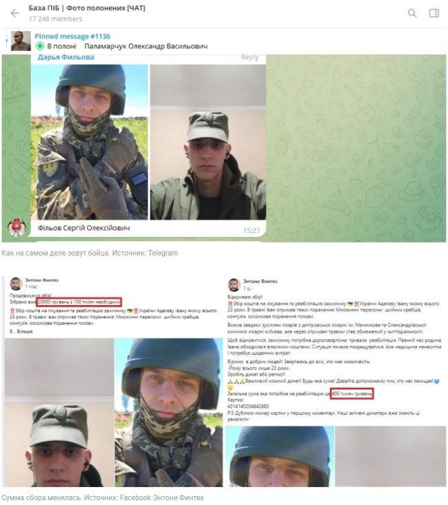 «Это мой сын! Сергей Алексеевич Филев. Он пропал! Никакие деньги на реабилитацию мы не собираем. Мы из Винницкой области, мы эти фотографии в группу пропавших опубликовали, а теперь их используют мошенники», – утверждает женщина.