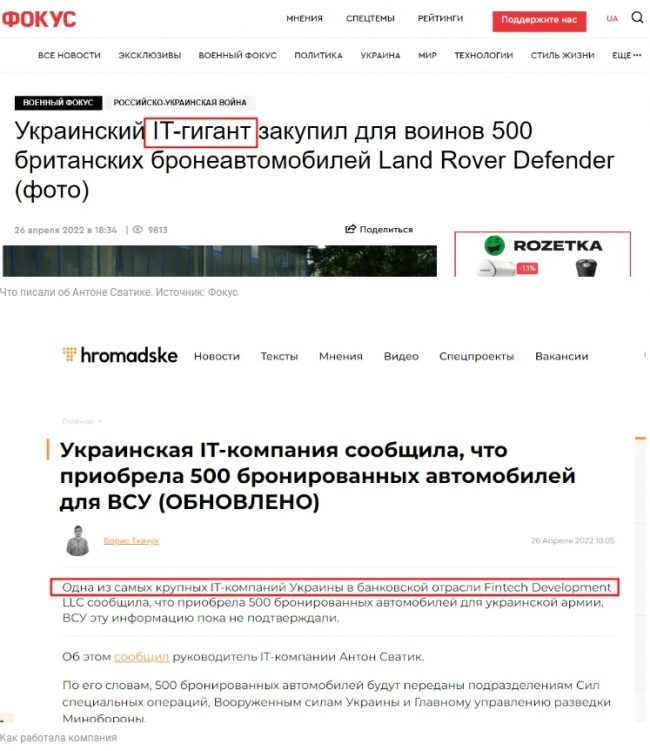 В прошлом году после новости о 500 бронированных машинах, которые в «Финтех Девелопмент» купили и передали ВСУ, несколько профильных IT-изданий написали о его «банке» (свои «продукты» он называет «Стереобанк», «Таксибанк»). Разбор сводится к тому, что никаких банков на самом деле не существует. А передачу 500 бронированных машин опровергли сперва военные, а после и сам Сватик. По его версии, покупка сорвалась.