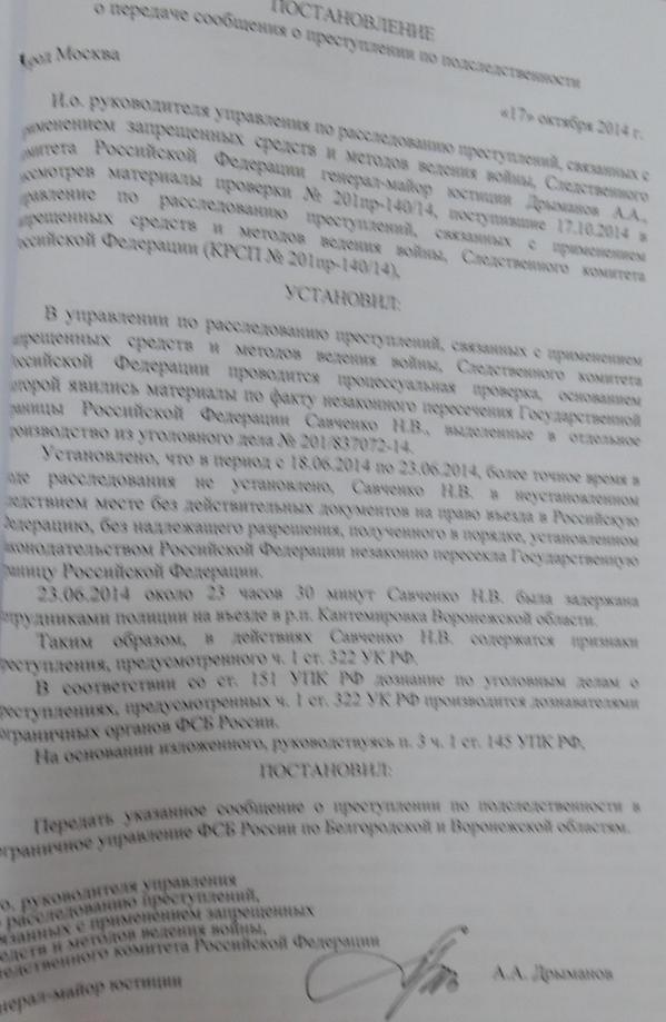"СК решил продолжать этот сюр с похищением. Раз она не была похищена, по мнению следствия, значит незаконно перешла границу. Это ст. 322 УК РФ", - сообщил Фейгин. Он предоставил скан судебного постановления по этому поводу.